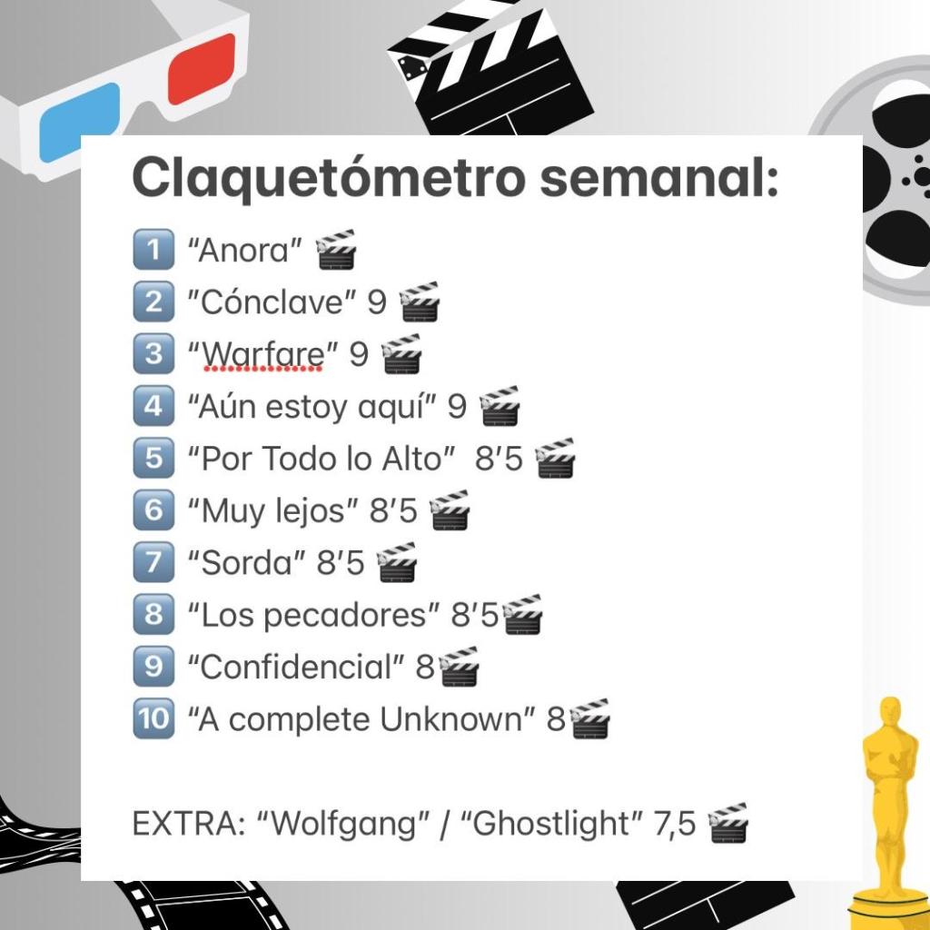Pues así quedaría el CLAQUETÓMETRO de esta semana. Una pequeña clasificación, personal e intransferible, absolutamente subjetiva, en donde genero un pequeño ranking de las películas en cartelera actualmente, al menos en la de los cines que yo suelo frecuentar, los de VO del centro de MADRID (especialmente los Renoir, mi segunda casa, así como los Embajadores, Yelmo Ideal y los Cinesa Manoteras/Proyecciones).
