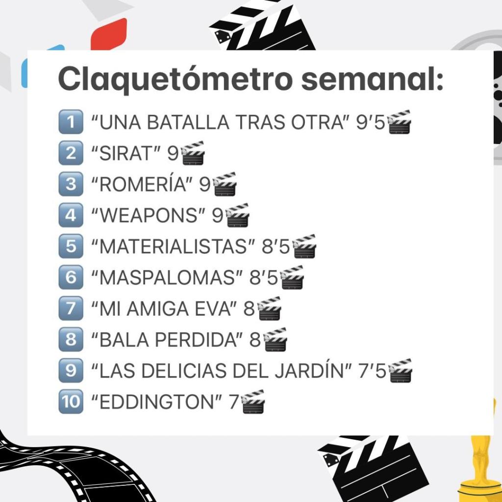 Un CLAQUETÓMETRO que responde a gustos exclusivamente personales y en el que no incluyo las películas estrenadas en el fin de semana en el que lo publico.