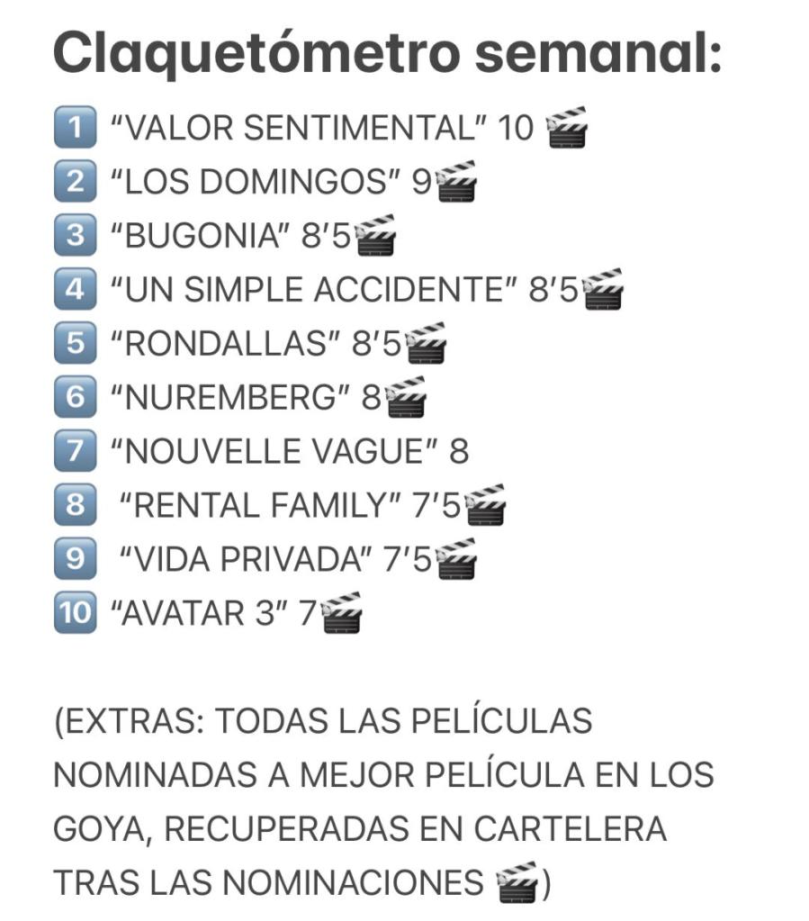 Empezamos con el primer CLAQUETÓMETRO del año, para que no se pierdan las buenas costumbres. ¡A lo loco con el 2026 y con el cine!!! Aquí tenéis mi “Ranking” de las películas que tenéis en cartelera. Un orden que no refleja las mejores películas, insisto siempre, que quede claro, sino las que a mí más me gustan, las que más he disfrutado en salas, y que, de ese modo, sólo responden a gustos exclusivamente personales e intransferibles. Espero que os guste y, lo más importante, que os sea útil de cara a elegir la película que vayáis a ver.