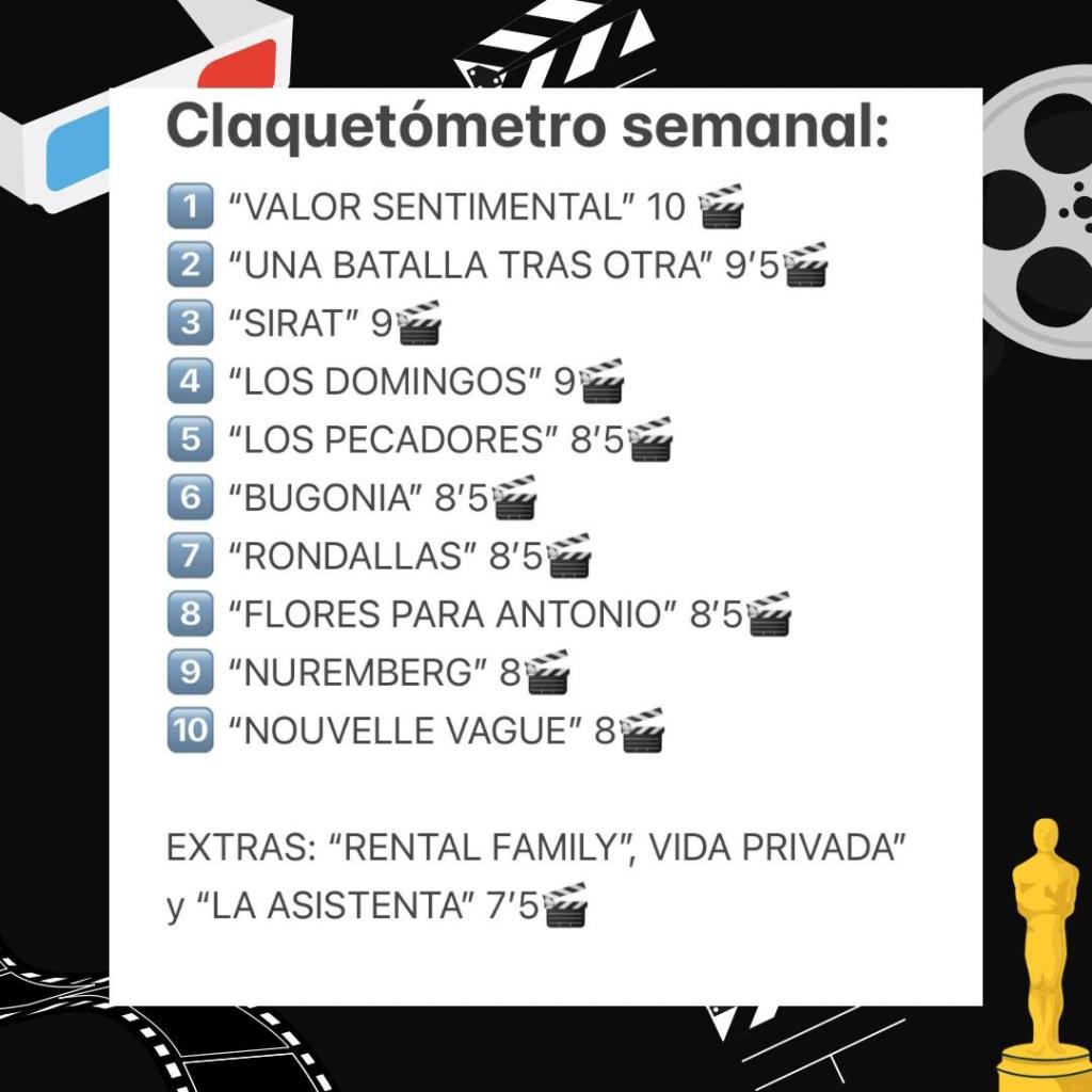 Y sin más rodeos, a la espera de ver la muy esperada “HAMNET”, que veré este fin de semana, os dejo por aquí mi CLAQUETÓMETRO SEMANAL, por si os ayuda para eso de ir al cine, en la que vuelvo a incluir “UNA BATALLA TRAS OTRA”, “LOS PECADORES” y “SIRAT”, por eso de la reposición en cines tras su éxito en las nominaciones de los OSCAR.