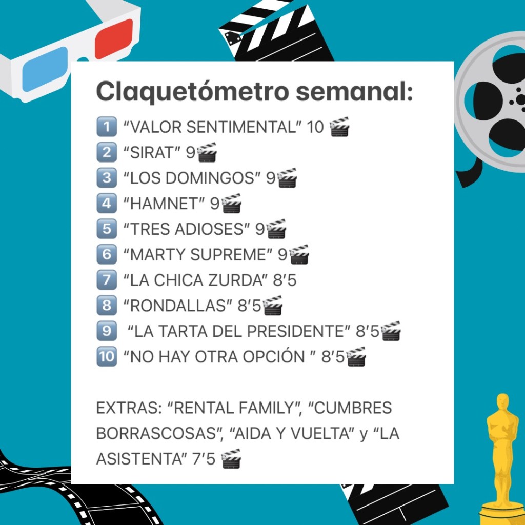 NOTA: CLAQUETÓMETRO hecho previo estrenos del viernes. Y siempre en función de gustos absolutamente personales e intransferibles. Aquí no están las mejores películas de la cartelera, sino las que a mí más me han gustado.