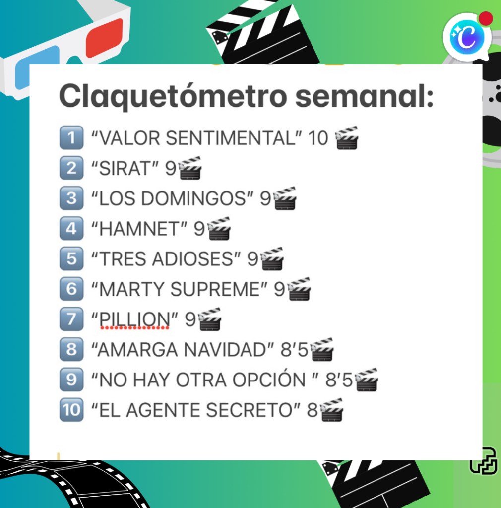 NOTA: CLAQUETÓMETRO hecho previo estrenos del viernes. Y siempre en función de gustos absolutamente personales e intransferibles. Aquí no están las mejores películas de la cartelera, sino las que a mí más me han gustado.
