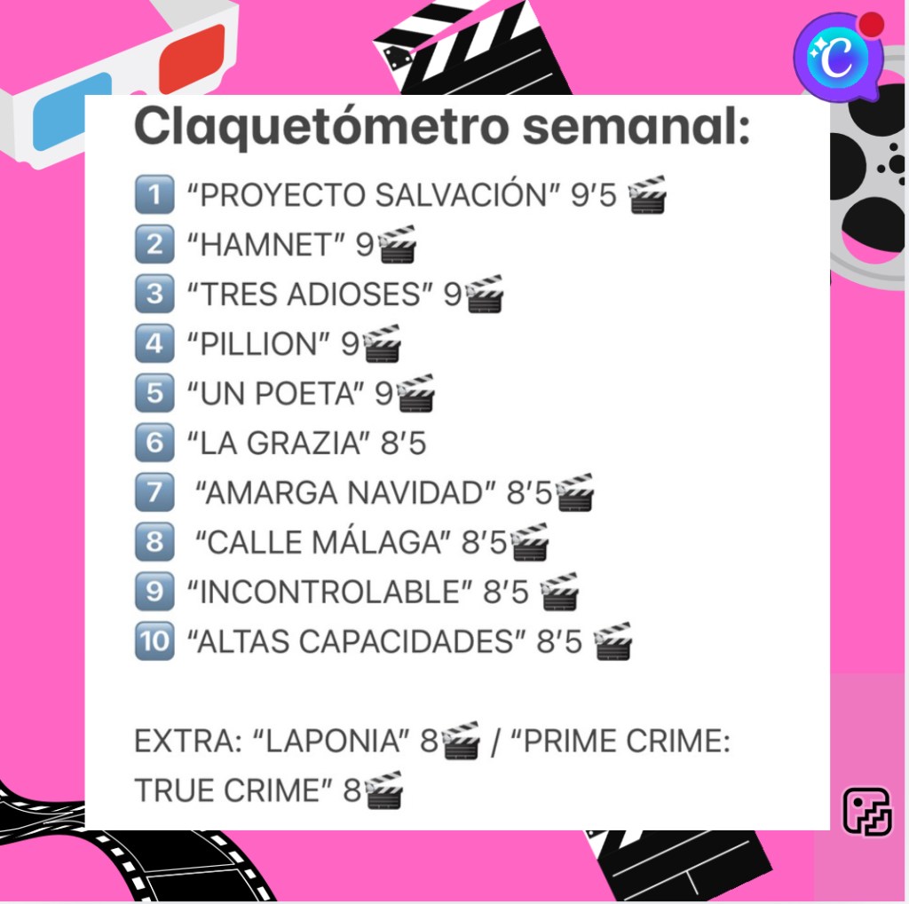 Es sábado y volvemos con nuestras rutinas cinéfilas con nuestro tradicional CLAQUETÓMETRO semanal. Esta vez, renovado, porque tenemos un nuevo número 1, ya que decimos adiós a la que para mí fue la mejor película del año anterior, la sensible e inteligente, maravillosa, “VALOR SENTIMENTAL”, para dar paso en el pódium, a otra maravilla “PROYECTO SALVACIÓN”, o la que podíamos calificar como el “ET del siglo XXI”. Fantástica. Pasamos del cine más autoral y de arte y ensayo, al más comercial y “palomitero”, lo cual no impide que sea de una calidad máxima, extrema, gourmet, … Que sea “Mainstream” no quiere decir que no pueda ser bueno. En este caso, personalmente, excelso. Una maravilla de la ciencia ficción. No os la perdáis, de verdad.